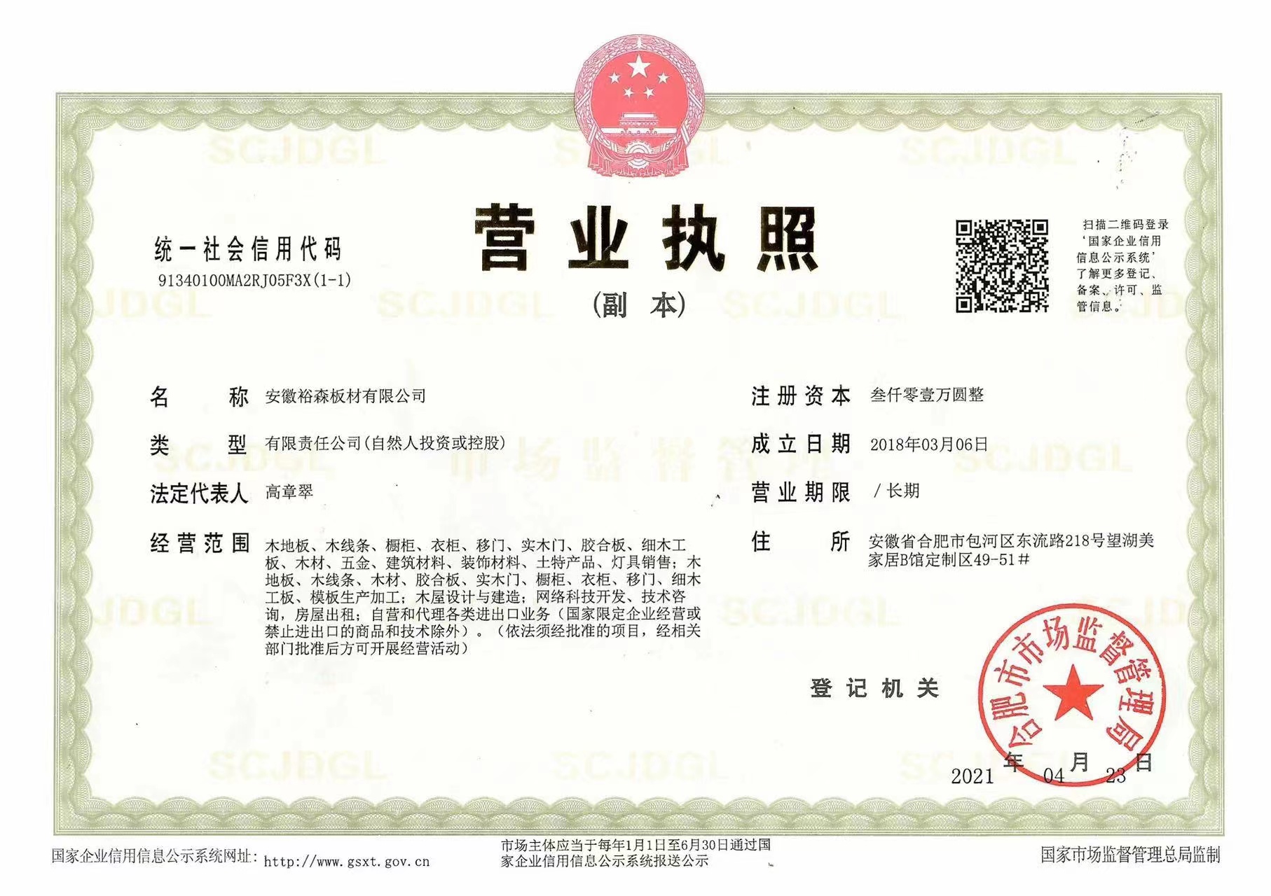 目前安徽裕森板材有限公司为“裕森”商标19类、20类、35类持有人。,除此之外所有与此类似或者添加前后缀的品牌均与我们无关。我司拥有“裕森”的19类、20类、35类商标,对于任何企业或个人侵犯裕森注册商标专用权的行为,我们都将予以打击,并追究相关主体的法律责任。除裕森官方外,其他未经裕森官方认证的平台发布的授权经销信息均是虚假信息,请大家谨防上当受骗。除此之外,其他打着裕森名义运营的网站均与我们无关。请认准裕森唯一官网:www.hfyusen.cn